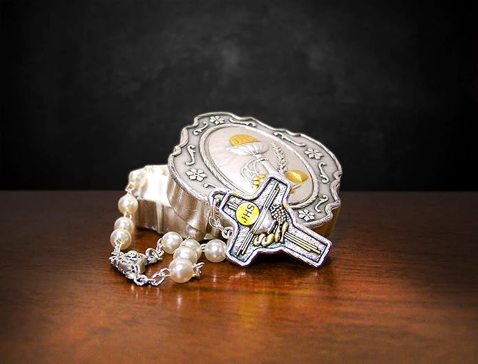 This elegant First Communion Rosary is crafted with imitation pearl beads. It features a traditional Loaves and Fishes cross, along with a silver-toned centerpiece of the Blessed Virgin Mary with Baby Jesus. It is housed in a sturdy metal keepsake case, adorned with an image of the Holy Chalice and Host, accented in gold.